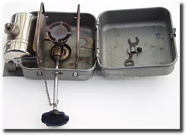 Zustand: Kocher komplett mit Anleitung (auf Russisch), Schlüssel und Reguliergriff. Sogar eine Ersatzdichtung für die Stopfbuchse der Regulierspindel war dabei. Hatte sicherlich auch ein paar Flugstunden.